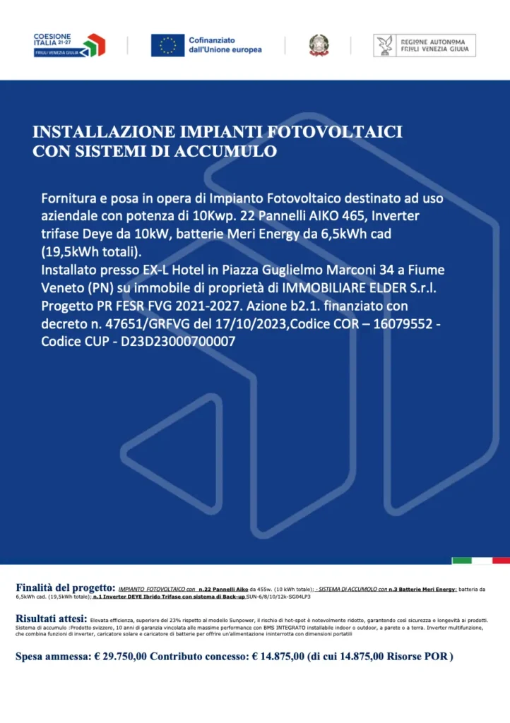 INSTALLAZIONE IMPIANTI FOTOVOLTAICI CON SISTEMI DI ACCUMULO Fornitura e posa in opera di Impianto Fotovoltaico destinato ad uso aziendale con potenza di 10Kwp. 22 Pannelli AIKO 465, Inverter trifase Deye da 10kW, batterie Meri Energy da 6,5kWh cad (19,5kWh totali). Installato presso EX-L Hotel in Piazza Guglielmo Marconi 34 a Fiume Veneto (PN) su immobile…
